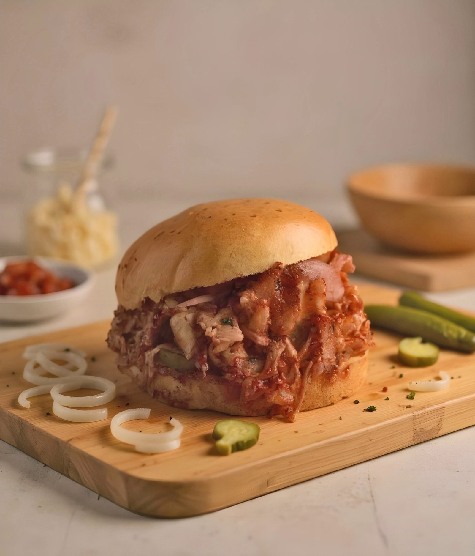 Brioche Bun, BBQ Pulled Pork, Pickle Onions & Pickles.