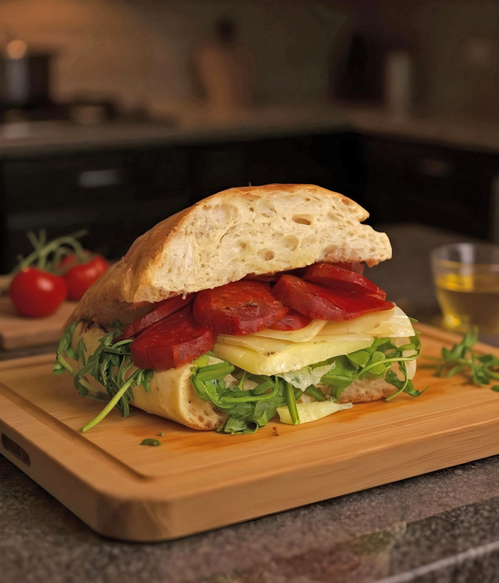 Ciabatta Bread, Spanish Chorizo, Manchego Cheese, Arugula & Olive Oil.