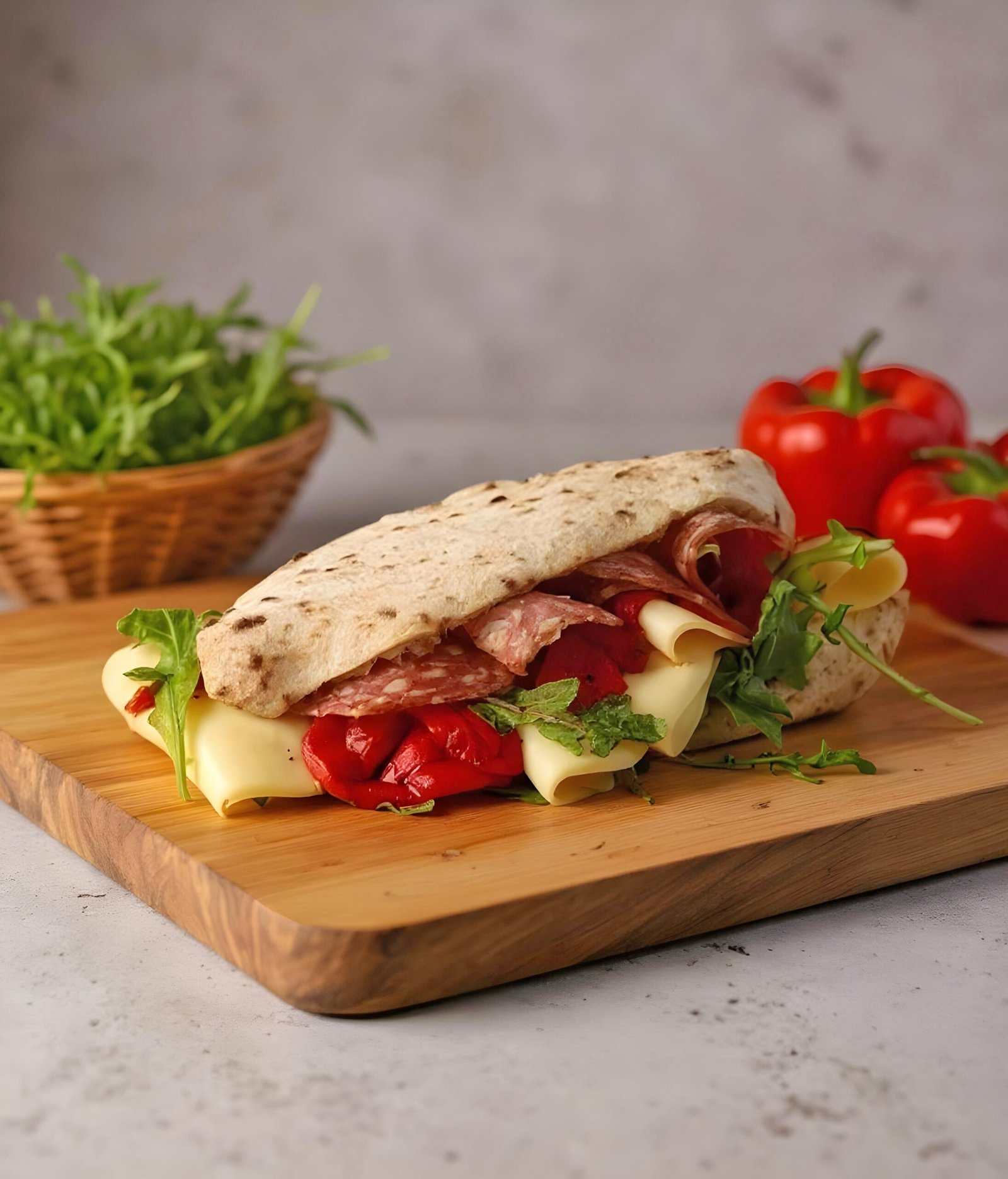 Panuozzo Bread, Porchetta, Cacio Pepe Spread, Arugula & Roasted Bell Peppers.