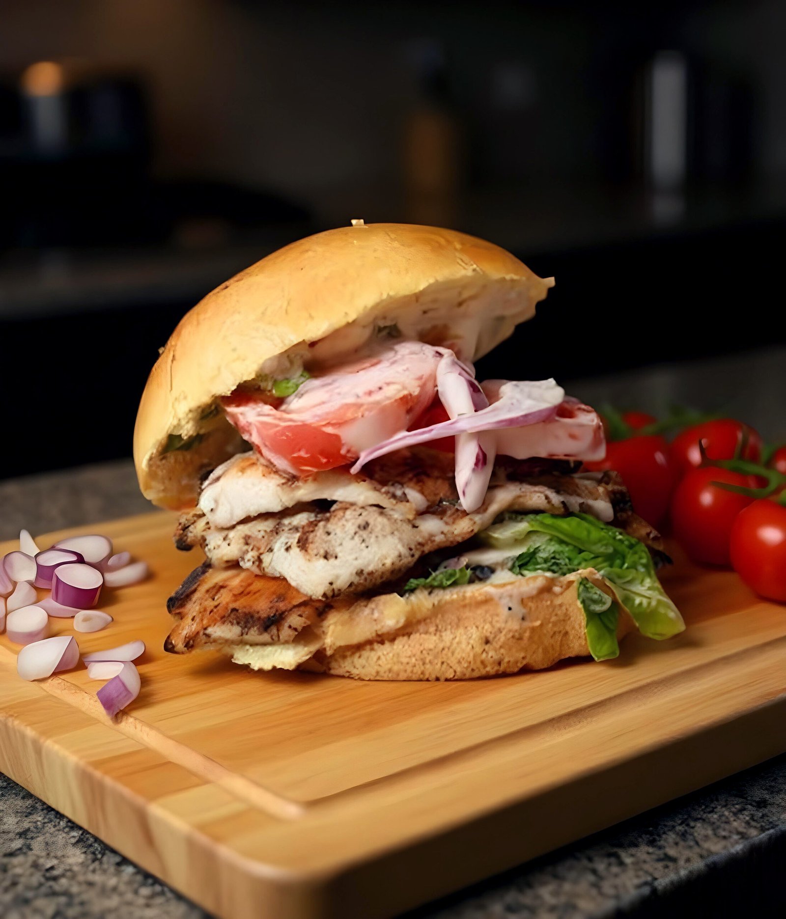 Brioche Bun, Grilled Chicken, Homemade Ranch, Red Onions, Lettuce & Roma Tomatoes.