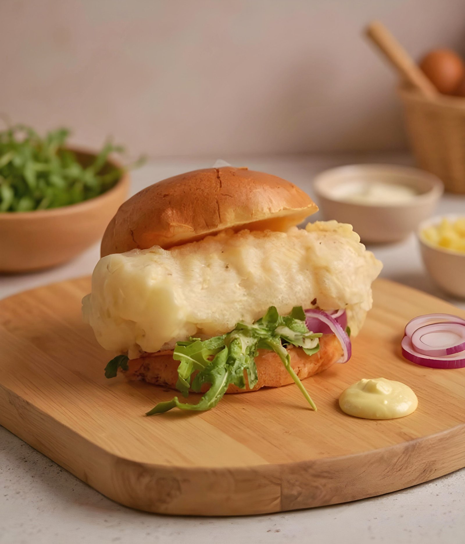 Brioche Bread, Breaded Cod, Red Onions, Arugula & Lemon Thyme Aioli.