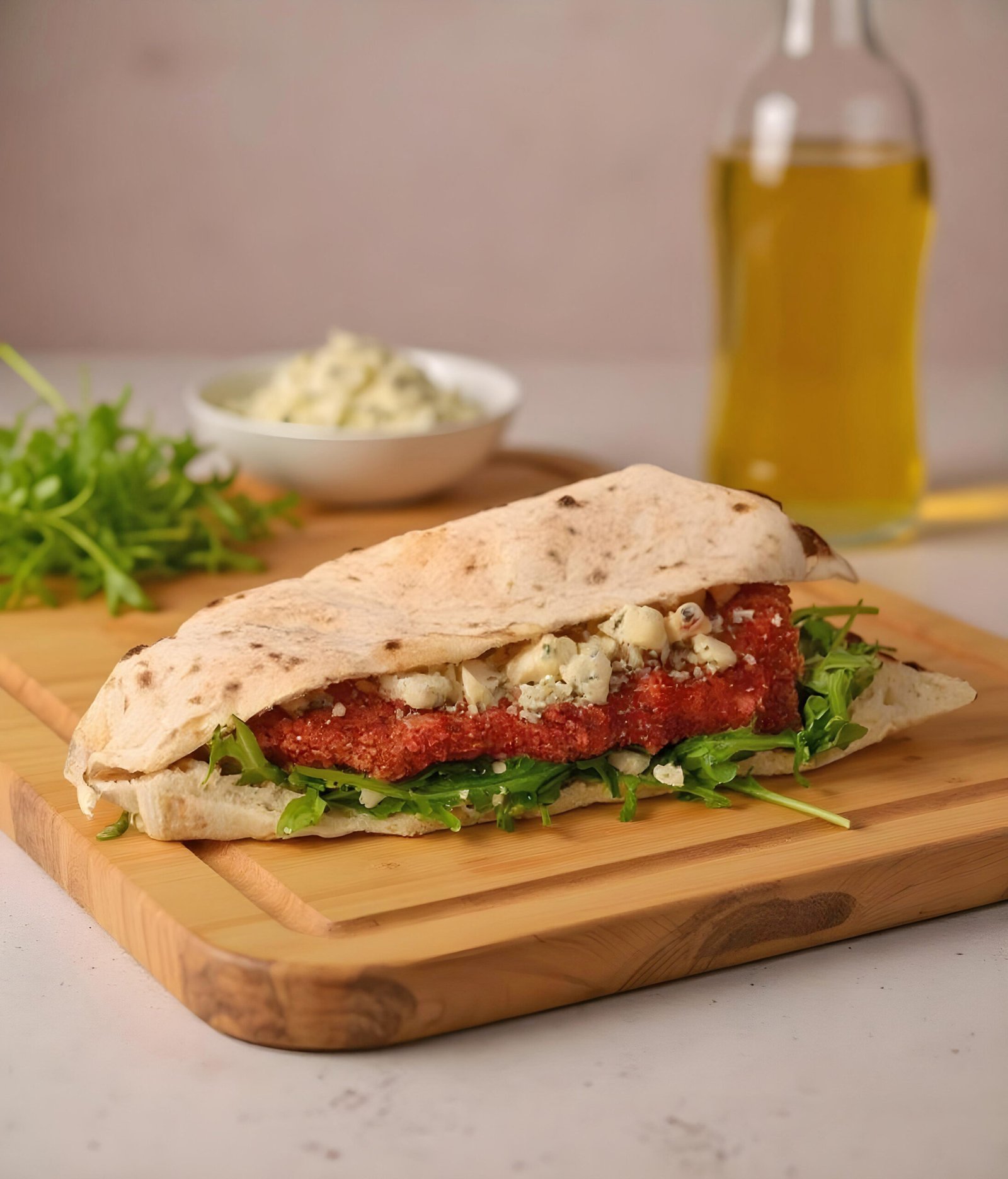 Panuozzo Bread, Veal Milanesa, Gorgonzola Cheese, Arugula & Olive Oil.