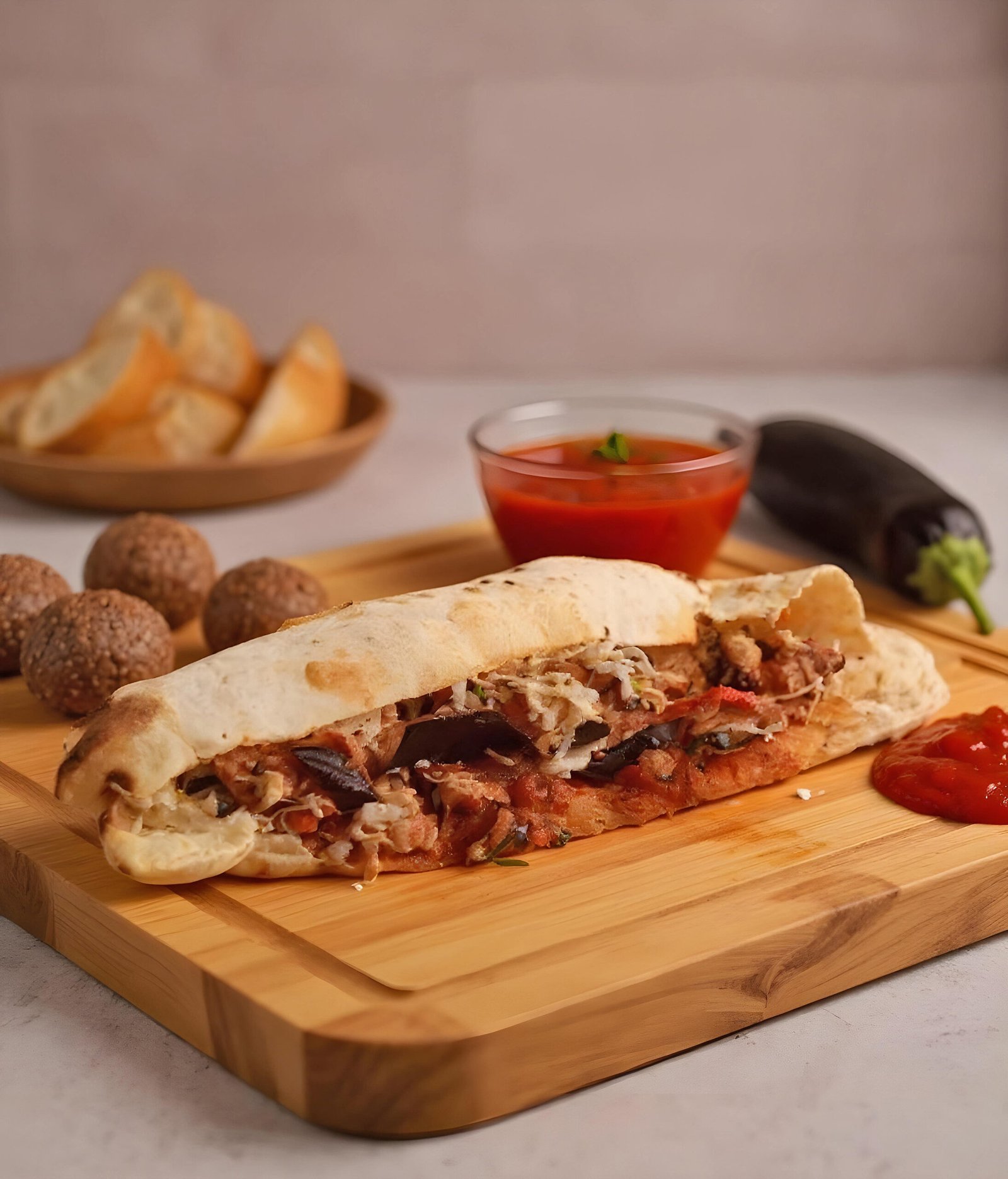 Panuozzo Bread, Homemade Meatballs, Ricotta Salata Cheese, Grilled Eggplant & Homemade Marinara Sauce.