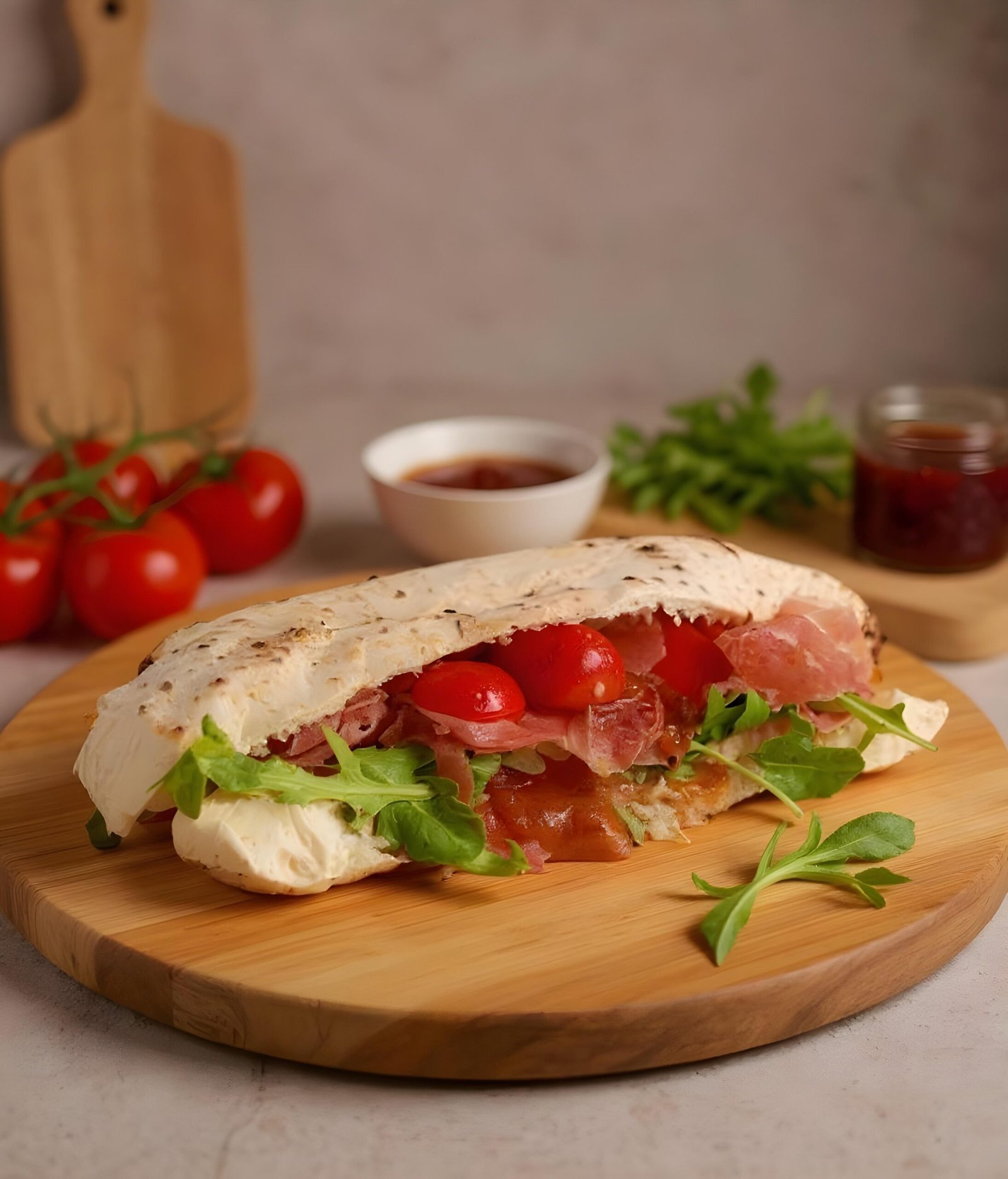 Panuozzo Bread, Prosciutto di Parma, Parmigiano Reggiano Spread, Arugula, Grape Tomatoes & Seasonal Jam.