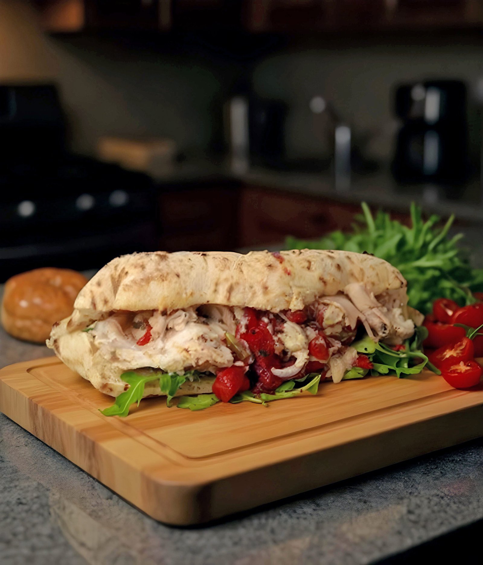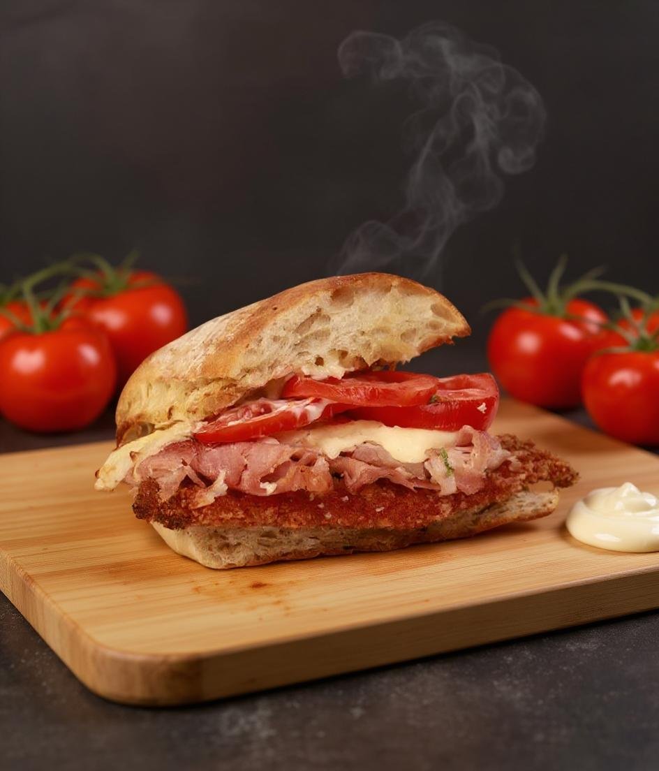Ciabatta Bread, Chicken Milanesa, Prosciutto Cotto, Melted Mozzarella Cheese, Roma Tomatoes & Mayonnaise.