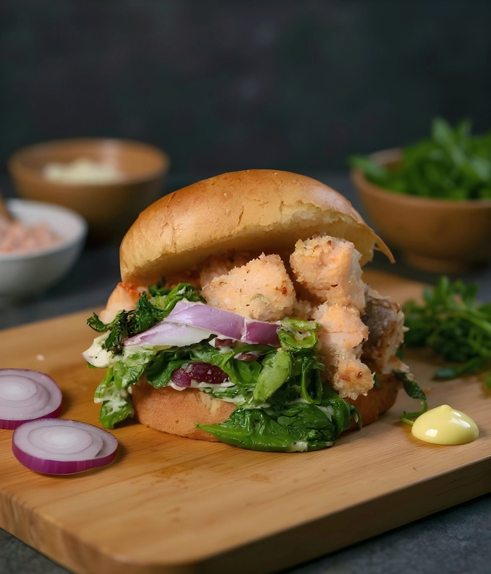Brioche Bun, Baked Salmon, Red Onions, Spinach & Lemon Thyme Aioli.